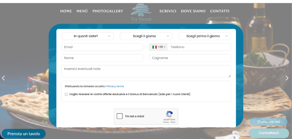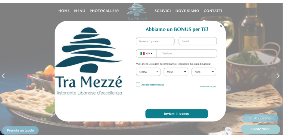 Questo è un esempio di Sito Web con i moduli di Movylo, pensato per aiutare il cliente a raggiungere obiettivi concreti: raccogliere contatti e semplificare le prenotazioni. Grazie al popup di registrazione e ai vari bottoni ben visibili per prenotare o contattare (telefono, WhatsApp, email), il sito guida l’utente all’azione in modo immediato e intuitivo.